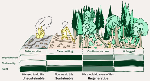 Trees of mixed ages and species are planted together then selectively felled when they reach maturity. By maintaining forest cover, this process and is more resilient and supportive of biodiversity. It is, however, far more labour intensive and less productive, thereby reducing the amount of carbon sequestration and increasing the operating costs for timber producers, making it uncompetitive. Large timber companies are now exploring forest restructuring to combine elements of continuous cover forestry with clear cutting, to get the best of both. - Unlogged