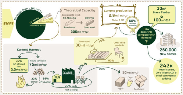 Thankfully the data tells a different story. At present, Germany and Austria are responsible for over 50% of global mass timber production, yet this utilises just 10% of their sawn softwood output, which in turn is only 10% of their theoretical maximum sustainable output, based on forest area. So by diverting material from other products such as furniture, and by harvesting more from currently underused forests, they could potentially increase mass timber production 100x. On top of that, Germany and Austria account for less than 10% of EU forest area, and many other countries have significant production which could also be scaled up.