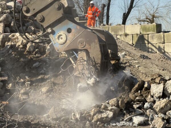 Reinforced concrete gets crushed in a hydraulic claw to remove the rebar